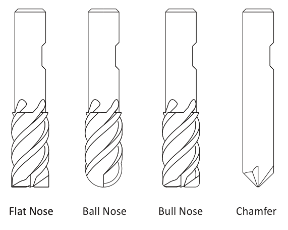 ابزار فرزکاری، دارای انواع دماغه تخت، توپی، گاوی و چمبر هستند.