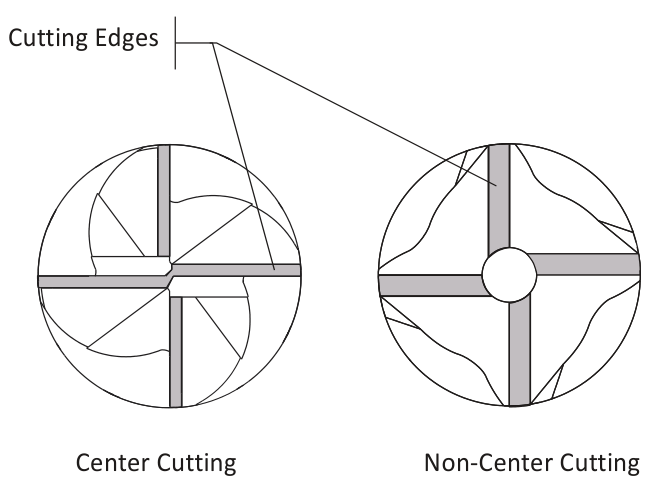 شکل 2 نمای انتهایی یک فرز انگشتی برش مرکزی و غیرمرکزی را نشان میدهد. توجه داشته باشید که لبههای برشی فرزهای انگشتی برش مرکزی، تا مرکز ابزار ادامه مییابد. مرکز دیگری، دارای یک سوراخ کوچک در مرکز است. فرزهای انگشتی برش غیرمرکزی برای فرو رفتن در مواد، نیازمند یک سوراخ راهنما و حرکت شیبدار یا مارپیچی هستند.