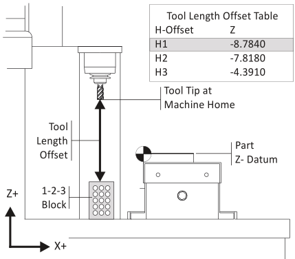 TLO توسط حرکت دادن اسپیندل با ابزار، از موقعیت Z خانه ماشین تا نقطه تنظیم ابزار بر روی ماشین پیدا میشود. این نقطه میتواند بالای پروب ابزار، یا همانطور که در شکل 11 نشان داده شده، بالای بلوک 1-2-3 روی میز ماشین باشد. فاصله عبوری از خانه تا بالای بلوک، ثبت میشود و مقدار به دست آمده، وارد رجسیتر TLO برای آن ابزار (به نام رجیستر H؛ زیرا حرف H پیش از آن در برنامه CNC میآید) میشود.