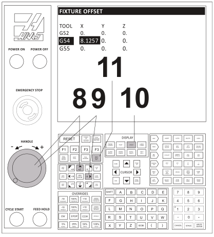 OFFSET PAGE: از کلیدهای جهتی استفاده کنید تا G54 (یا هرچه که میخواهید برای افست نگهدارنده تنظیم کنید) مشخص شود. |