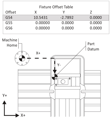 شکل 2 یک نمای کلی از نحوه عملکرد افست XY را نشان میدهد. اپراتور CNC مقادیر افست نگهدارنده را با جابهجا کردن ماشین از موقعیت خانه تا مبدا برنامه CNC پیدا میکند. این نقطه تا زمانی که بتوان آن را با ابزار مکانیکی مانند لبهیاب یا پروب قطعه یافت، میتواند هر نقطهای روی قطعه، کالا یا نگهدارنده باشد.