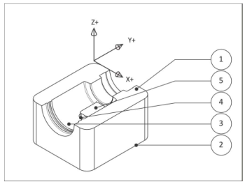 شکل 1 یک قطعه منشوری را نشان میدهد. تمام ریختهای ماشینکاریشده در موازات صفحه XY میباشند. هر سطح Z میتواند توسط موقعیتدهی ابزار در یک سطح Z ثابت و حرکت محورهای XY برای تخلیه مواد، ماشینکاری شود. با ارسال ابزار از بعد جلو یا عقب، میتوان به هر ریخت دسترسی پیدا کرد. در این مثال چندین صفحه برش وجود دارد؛ بالای مدل (1)، بالای رویه که سوراخها در آن شروع میشوند (2)، پایین محفظه که شکافها در آن شروع میشوند (3)، پایین شکافها (4)، و پایین سوراخ از طریق مرکز (5).