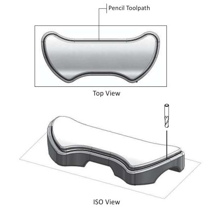 مسیرابزارهای ردیابی مدادی، نوعی ماشینکاری کالای باقیمانده (فرزکاری REST) هستند که با ردیابی یک ابزار در راستای درزهای بین سطوحی که یک زاویه داخلی ایجاد میکنند کار میکنند. تصویر 10 یک مسیرابزار مدادی بین راستای فیله داخلی را نشان میدهد. این کار، هر حلزونی باقیمانده در ناحیه را تخلیه میکند و یک درز عالی ایجاد میکند.