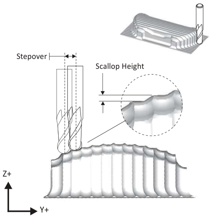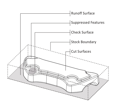 یک راهاندازی سهبعدی معمول، در شکل 4 نشان داده شده است. گاهی اوقات سطوح مازاد، برای گسترش مسیرابزار تا محدودههای XY و یا ادامه ماشینکاری ابزار در راستای دیوارههای عمودی محور Z نیاز هستند.