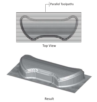 مسیرابزارهای موازی، به سرعت محاسبه شده و قابل اطمینان هستند. با این حال، معمولا برای تمیزکاری حلزونیهای سنگین (قلهها)، به عبورهای صیقلکاری اضافی نیاز دارند.