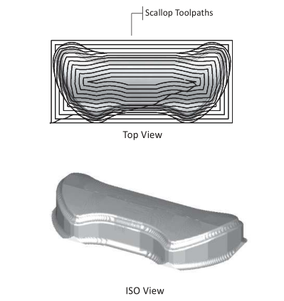 حلزونیها را که میتوان در شکل 7 دید، برجستهترین بخش نزدیکترین دیواره هستند. مقادیر کمِ گامروبهجلوی مسیرابزارها، حلزونیهای کوچکتری ایجاد میکند. دقت کنید که چگونه ارتفاع حلزونی با فرم کلی قطعه تغییر میکند.